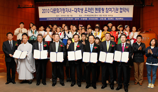For the success of this project, Yeungnam University will be in charge of selection and education of mentors, as well as operation and administration, with the Center for Multi-Cultural Korea and supervise outdoor experience events and camping. In addition, it will provide expenses together with Gyeongsangbuk-do to enhance educational performance and for the smooth operation of the project. Furthermore, the Ministry of Justice will provide 200 PCs to children of multi-cultural families for the online mentoring, and is scheduled to support on-site experience based educational programs to help their understanding on the legal culture. Participation of companies is also active and Kyowon will provide a year's supply of home-study materials for helping with the basic education of multi-cultural family children, and SK Telecom and SK Broadband will provide free internet services and computer peripheral devices for online education.